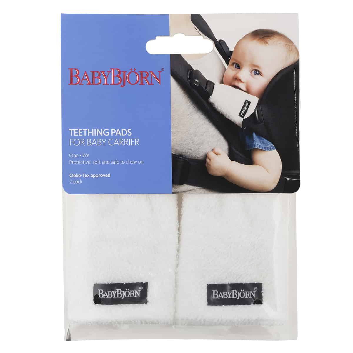 The teething pads are easy to slip on and off the baby carrier – simply unfasten the head support and slip the teething pads over the straps.