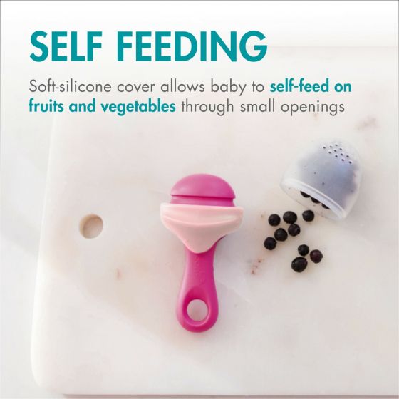 We don’t mean to mouth off, but let’s be real about how mesh feeders can be a real mess and difficult to clean. Our silicone teething feeder has some bite to it; allowing for easy feeding with its interior firm stem that forces food out where babies can get to it. It’s simple to clean and more durable than mesh feeders. Boon totally has a handle on baby’s snack time and when something is this good, we think it’s okay to get a little mouthy about it.