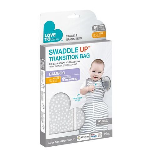 Love to Dream™ Transition Bags can help to ease this adjustment, enabling you to zip off one ‘wing’ to start with (for a few sleep cycles), until your baby is ready to sleep with both arms out.
