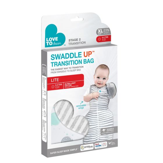 Love to Dream™ Transition Bags can help to ease this adjustment, enabling you to zip off one ‘wing’ to start with (for a few sleep cycles), until your baby is ready to sleep with both arms out.