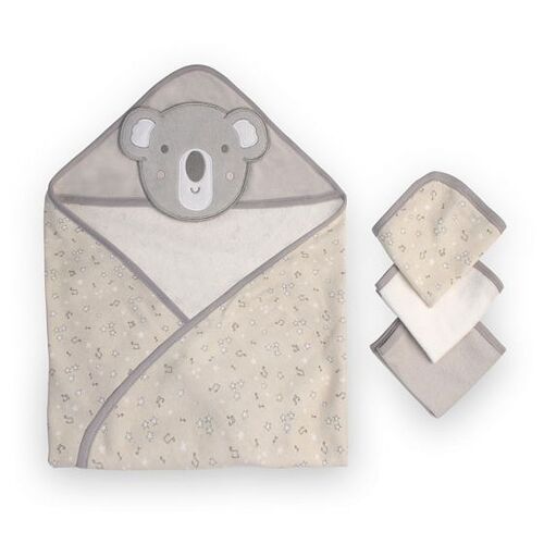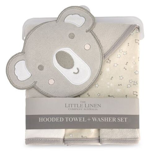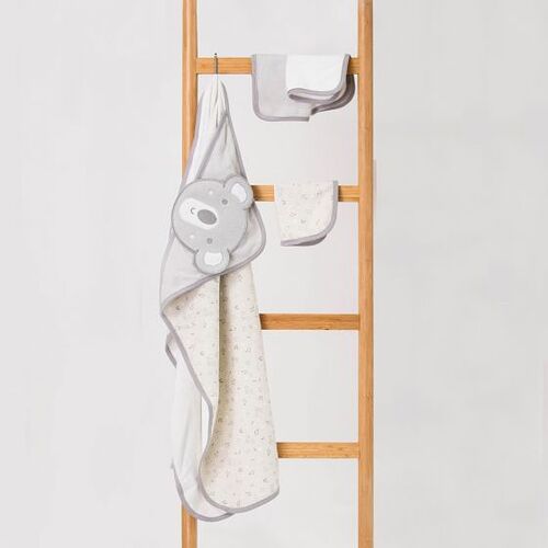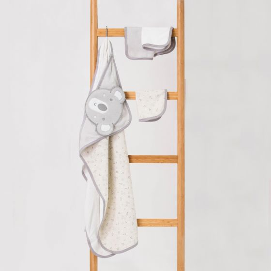 This curious and Cheeky Koala hooded towel and washer set will make any bathtime super cute! In a soft grey colour palette, this set features an embroidered koala hooded towel with three beautiful towelling washers.