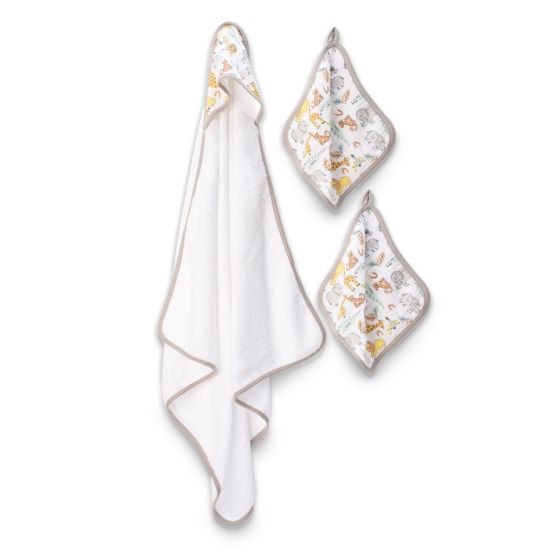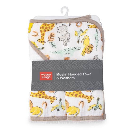 Watch as Ernie and his jungle friends stomp around on this Weegoamigo Muslin Hooded Towel + Washer set. Featuring a printed muslin design covering a soft and absorbent cotton terry towel, they are sure to become a bathtime favourite.