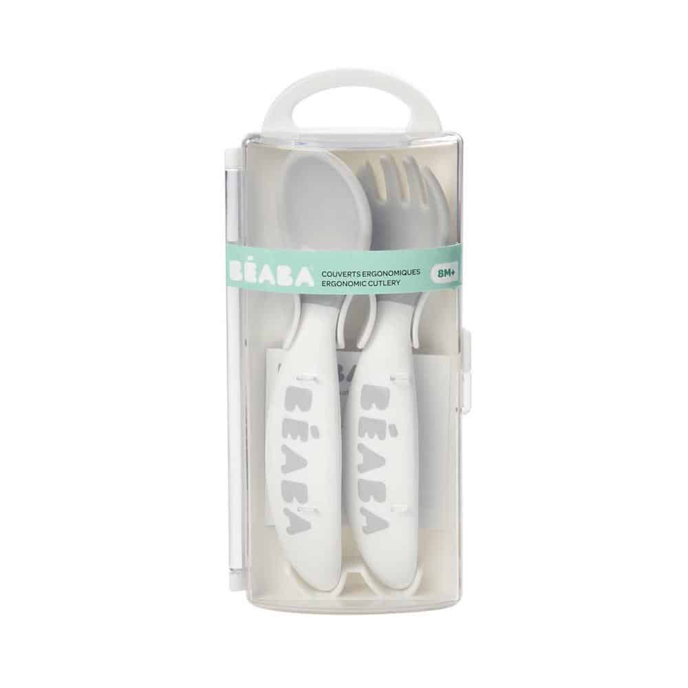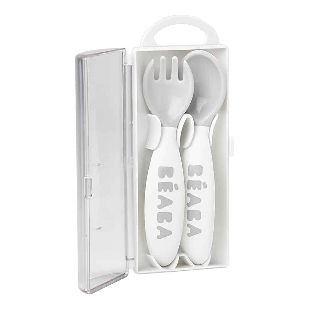 2nd stage cutlery fork and spoon set. Perfectly adapted to baby’s grasp, the set comes with a protective storage case for meals on the go.