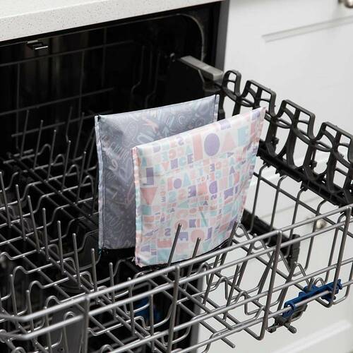 washable. Prior to washing, flip bag inside out and rinse off any food