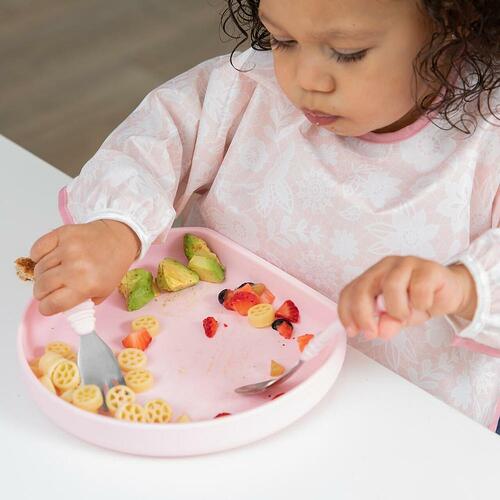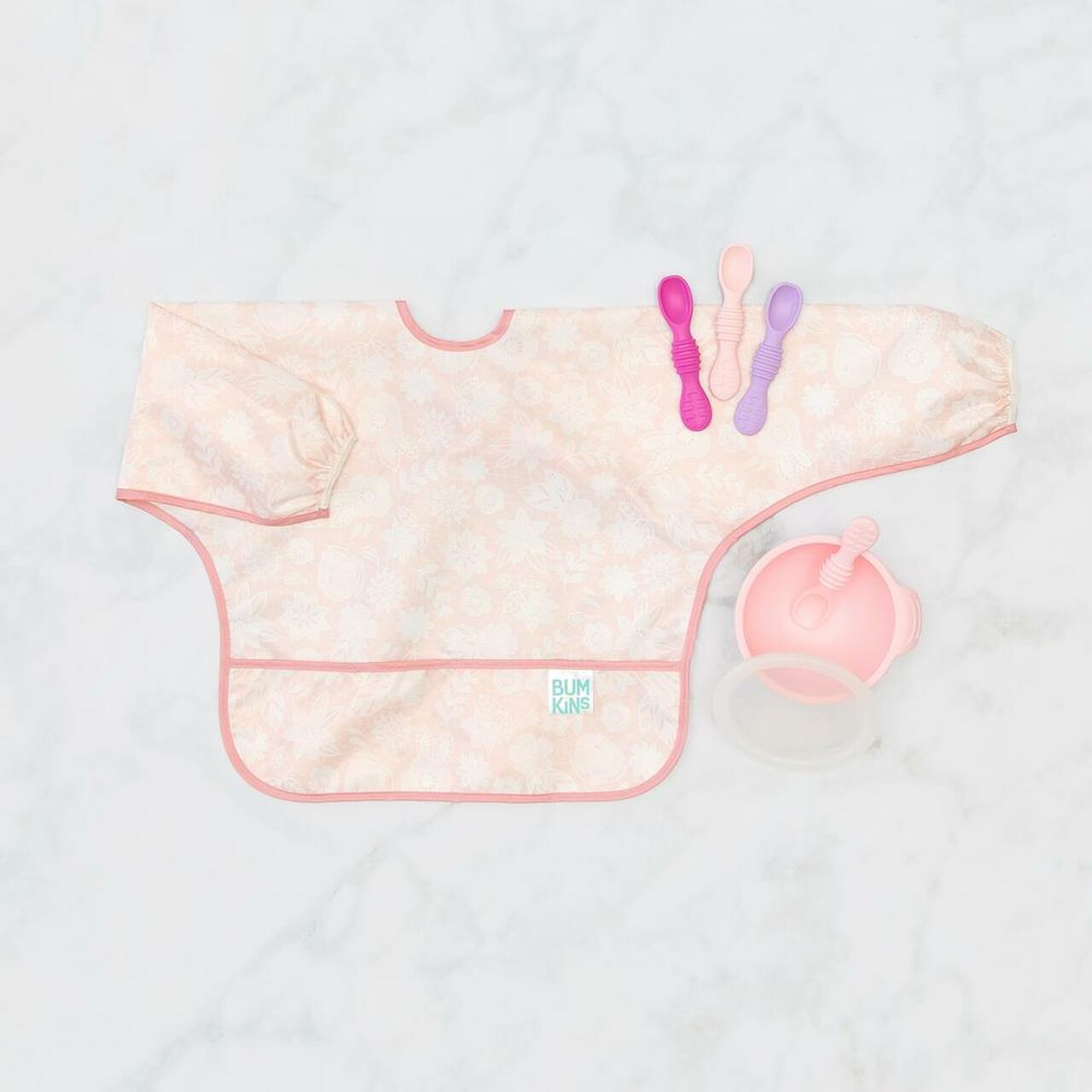 The Bumkins Sleeved Bib saves one outfit at a time. With a handy crumb catcher / catch-all pocket for containing spills. Generously sized and made from Bumkins lightweight, waterproof, easy-wipe, stain and odor resistant fabric. Single ply construction means no worrying about icky stuff growing between layers of fabric. Without a cotton layer, stains and smells don't stick. Adjust the fit with a back-tie closure and adjust sleeve length with elasticized cuffs. Wipeable and machine washable for easy cleaning so you can use it over and over again!