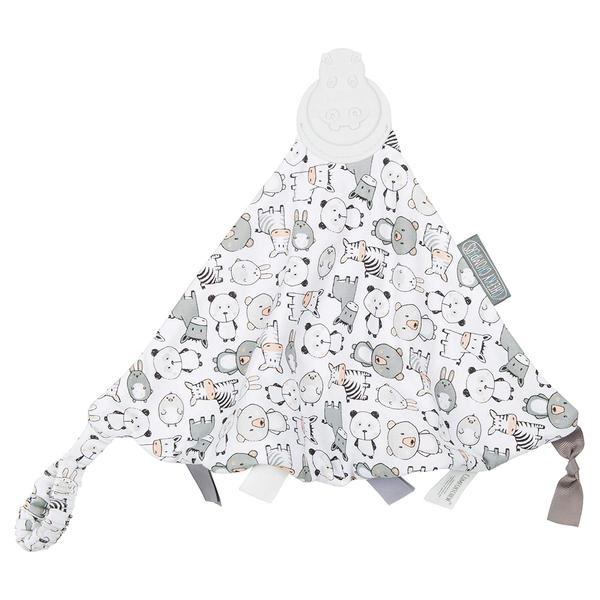 The attached signature hippo teether is designed to massage and soothe those tender little gums and is 100% safe to chew.