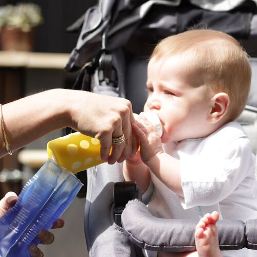 It can be ‘recharged’ in just 10 minutes* to be used again for the next feed and can be used hundreds of times. The pouch is designed not to heat up too high in order to avoid burning so you don’t need to worry about bring gloves. When used as a cooler 15-20 minutes in the fridge is enough time to give you the same amount of cooling time. *The time it takes to heat the bottle depends on bottle size and how cold the liquid is.