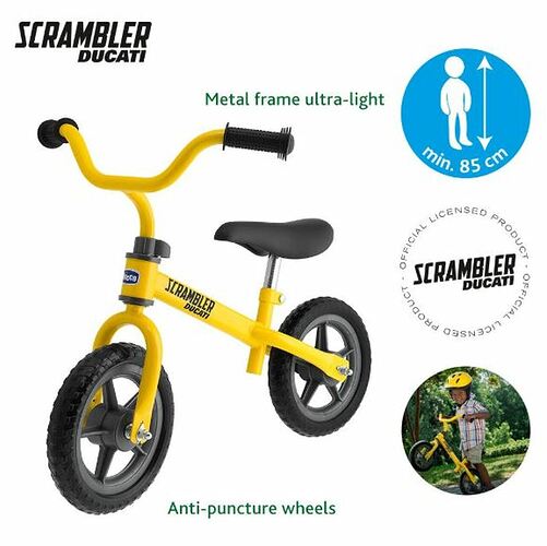 The new balance bike with the colours and determination of a Ducati Scrambler. This adventurous bike helps your little one learn how to balance on two wheels and assists in their transition to a pedal bicycle.