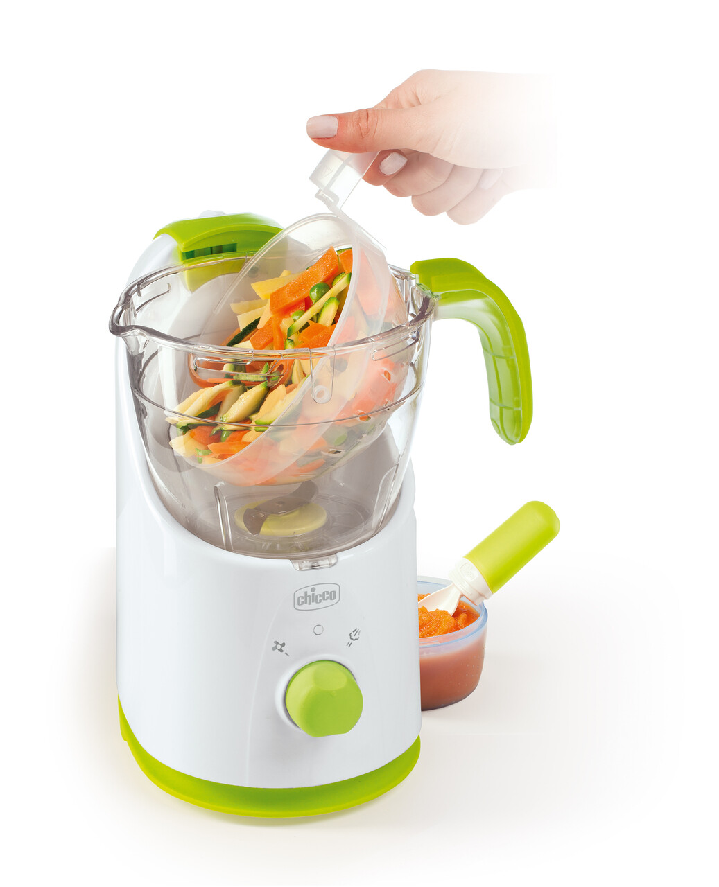 Your Easy Meal Steam Cooker is the easiest and fastest solution to turn all your ingredients into healthy and delicious meals for baby to enjoy! This versatile kitchen appliance is suitable for chopping, steam cooking, mixing and warming healthy baby food. The practical steam cooker by Chicco is the best choice for easing your little one’s transition from pureed food to solid food.