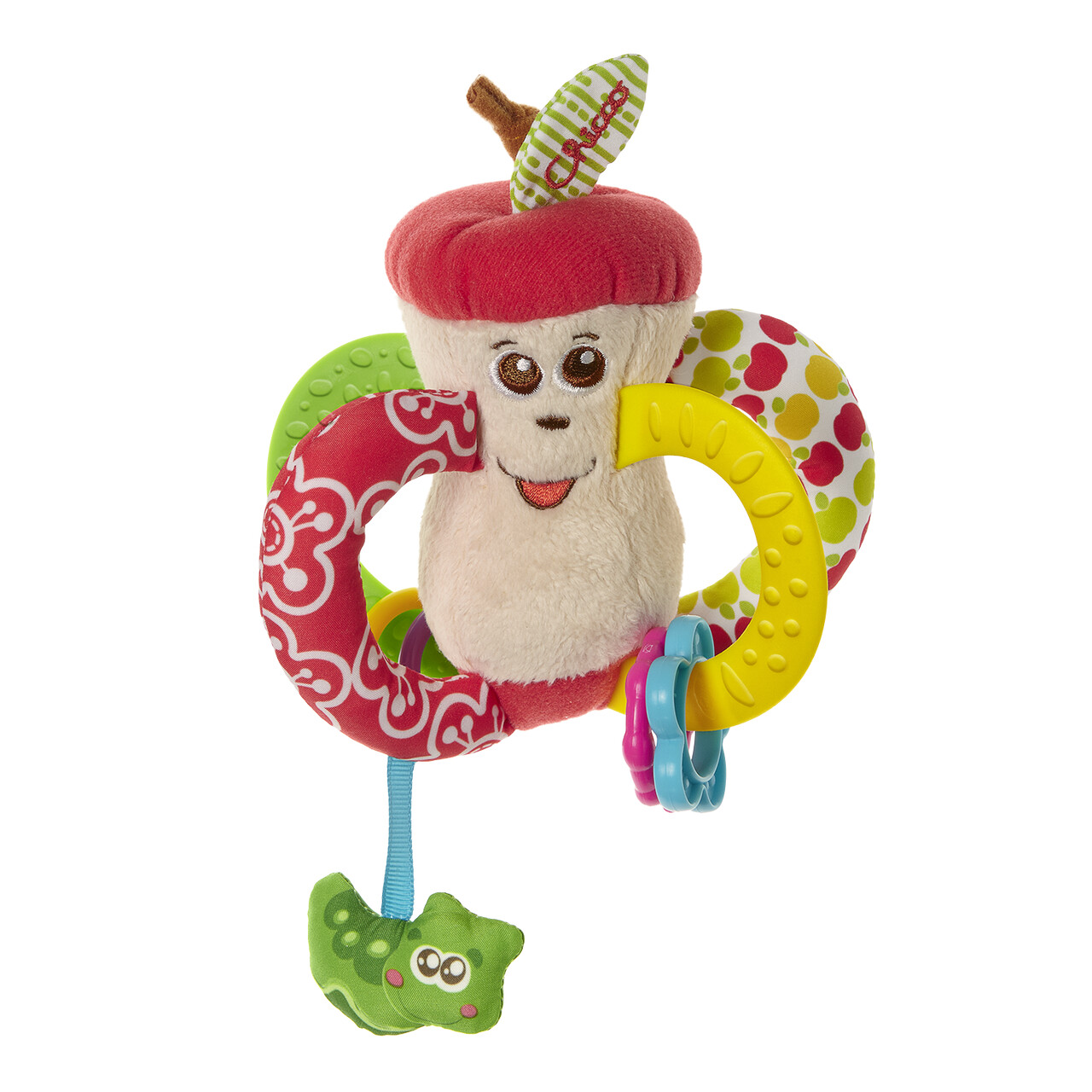 A sweet and fun apple rattle for baby's first toy! Your baby's new friend is incredibly soft, light and colourful, with plastic and fabric parts, they are ideal for first activities.- The Easy to grip apple was designed with 4 large handles so it is easy to hold with both hands. Two handles are made from soft plastic, ideal for teething, and have sliding rings; whilst the other two like the caterpillar are made from fabric to stimulate tactile skills.