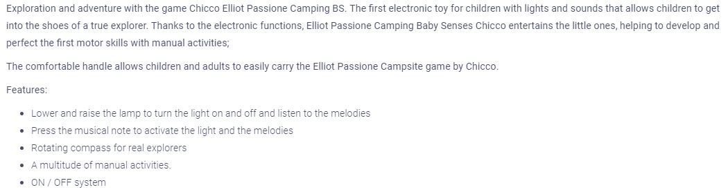 1 x Chicco - Elliot Camping Lover Musical Toy. Batteries: 3 x LR 44 1.5V (included)