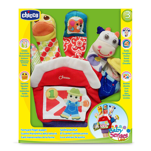 A Glove Puppet to wear to share with the child's special moments of the game . Will be a discovery to see that the farm comes to life in his hands and with the stories of the parent : cob squeaks , the duck does squeak , the mouse and the clinking cow.With the illustrated booklet it can be counted together : 1 farmer, 2 sheep and 3 pigs .