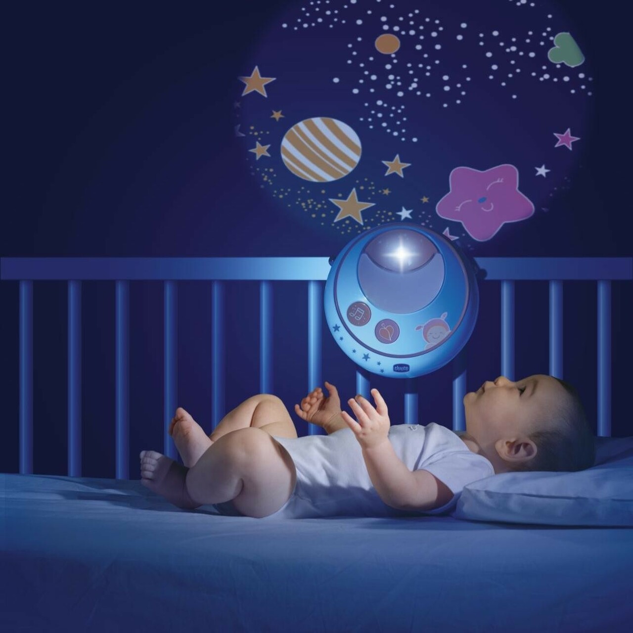The double projection cot mobile that projects images of the coloured stars and planets through the bedroom, creating a magical and soothing atmosphere.