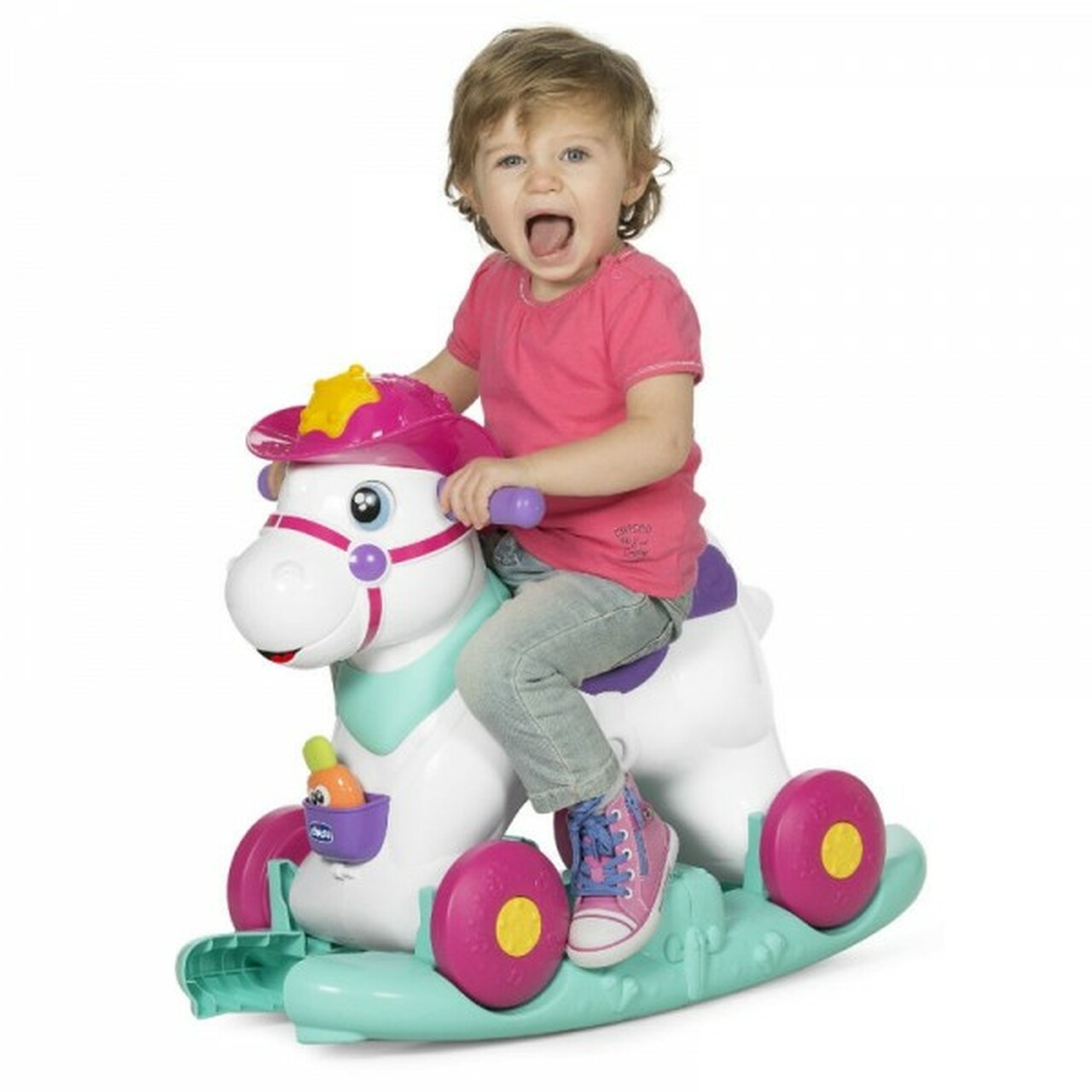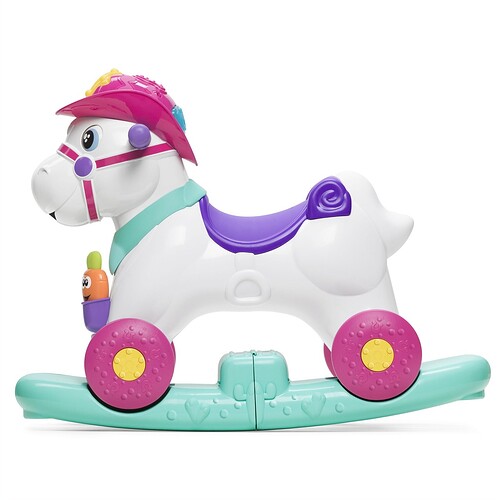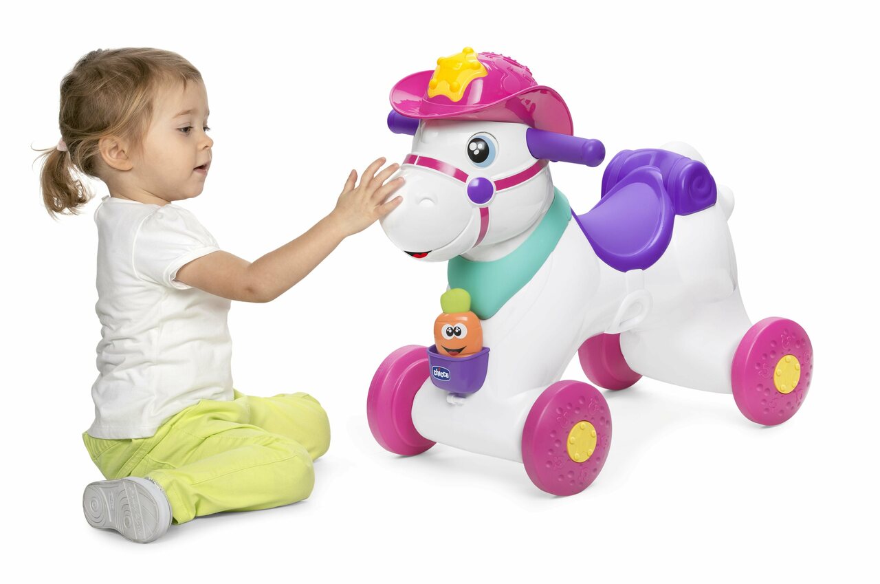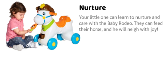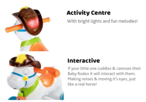 Baby Rodeo is the new interactive rocking horse for children. When your little one feeds Baby Rodeo, she makes happy sounds. When Baby Rodeo receives caresses on her face, she moves her eyes and neighs to let your little one know she is enjoying the praise.