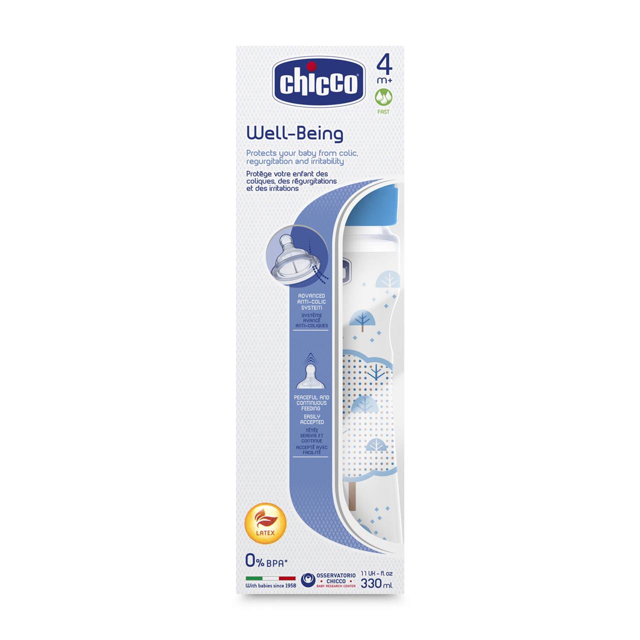 The 330ml Wellness Bottle with Latex soft anti-colic teat. The Wellbeing Feeding bottle is made from Polypropylene and is BPA free. The Anti-colic valve of the physiological teat helps to reduce the incidence of colic. The bottle comes with a Fast flow teat.
