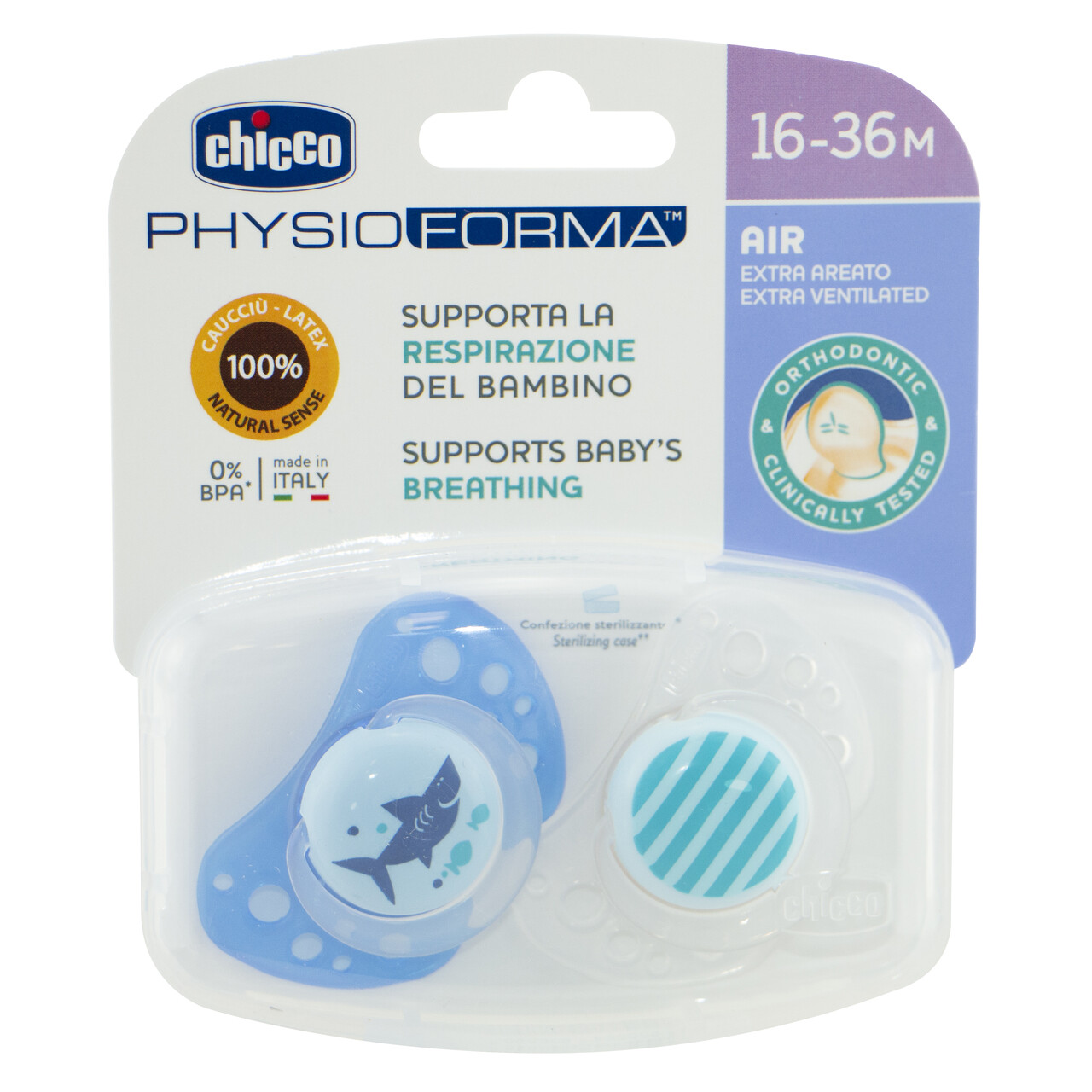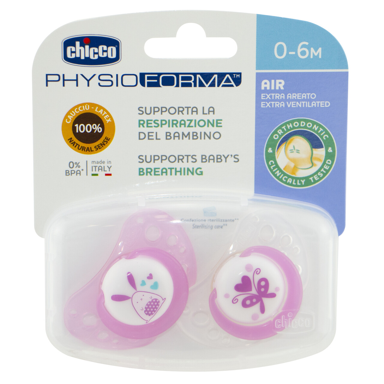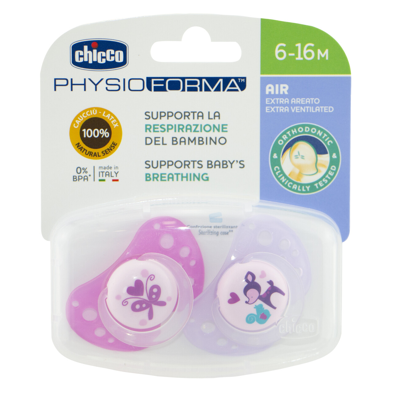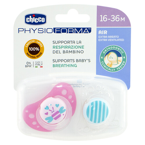Physio Air creates maximum ventilation and maximum freshness with multiple holes designed for maximum airflow; to keep babies sensitive skin dry and free to breath. Ergonomic shape:the soother contours to baby’s face, ensuring the correct space for chin and nose. Rounded edges: for a gentle touch on baby’s skin.