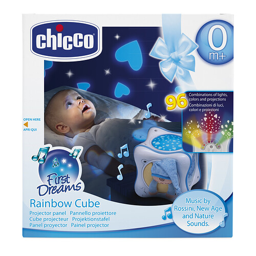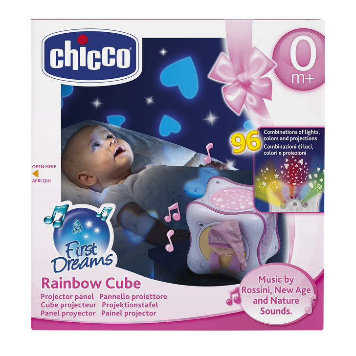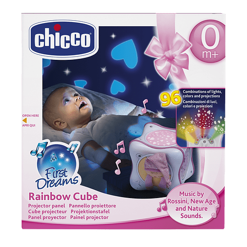 The Chicco Rainbow Cube Musical Night Light projector offers you over 90 different combinations of projections, colours, musical melodies and directions which help relax and soothe baby and allows you to personalise the nursery to achieve the perfect ambience and a colour-therapy atmosphere.