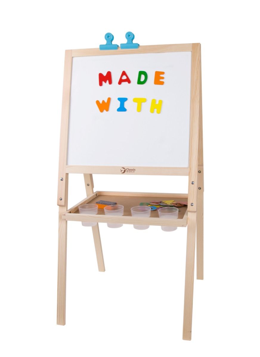 Contains four cups for paint, magnetic letters, a duster and two clips up the top to hold paper