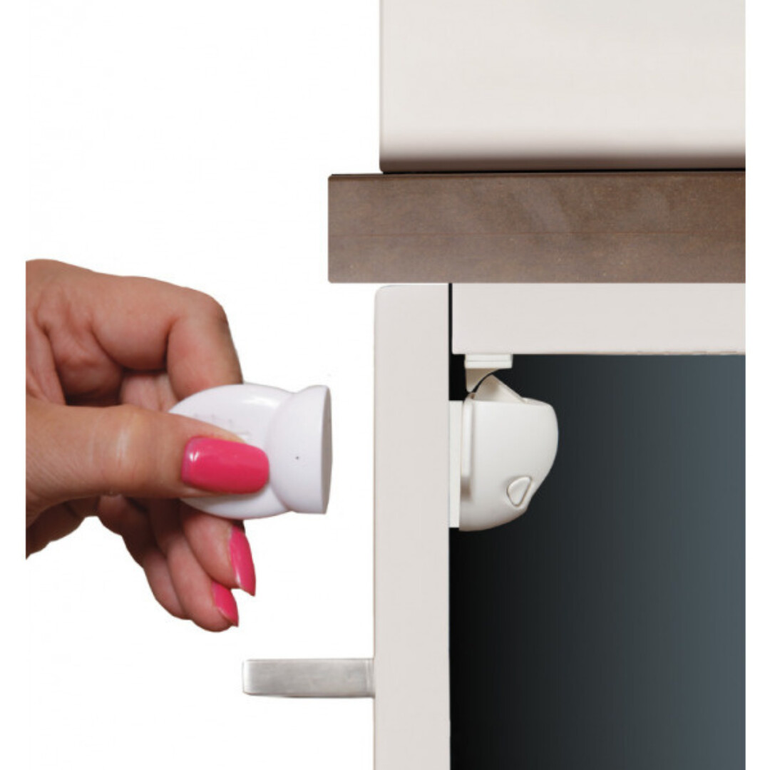 SELF-LOCKING WITH MAGNETIC KEY – The secret to our Adhesive Mag Locks® design is a self-locking mechanism that can be only opened by placing the powerful magnetic key over the lock. Simple but ingenious, this makes retrieving everyday items from cabinets and drawers quick and painless. Keys can be easily and accessibility stored out of a child’s reach, such as on top of the refrigerator.