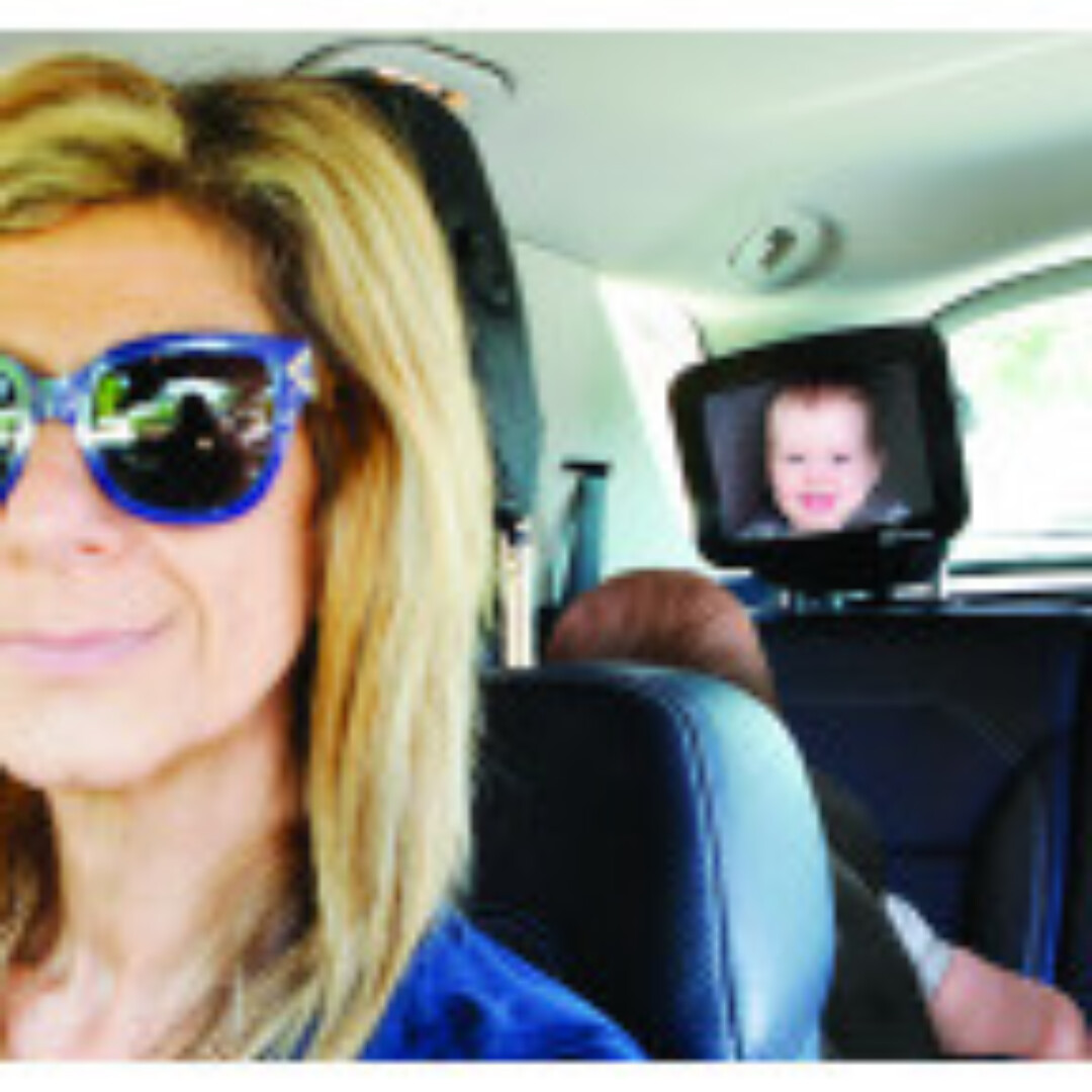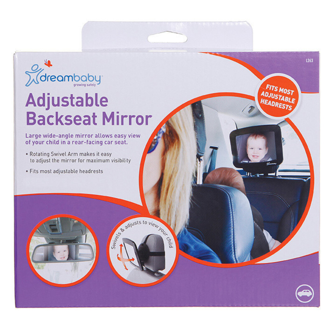 The Dreambaby® Adjustable Backseat Mirror allows an easy view of your child in a rear-facing car seat.