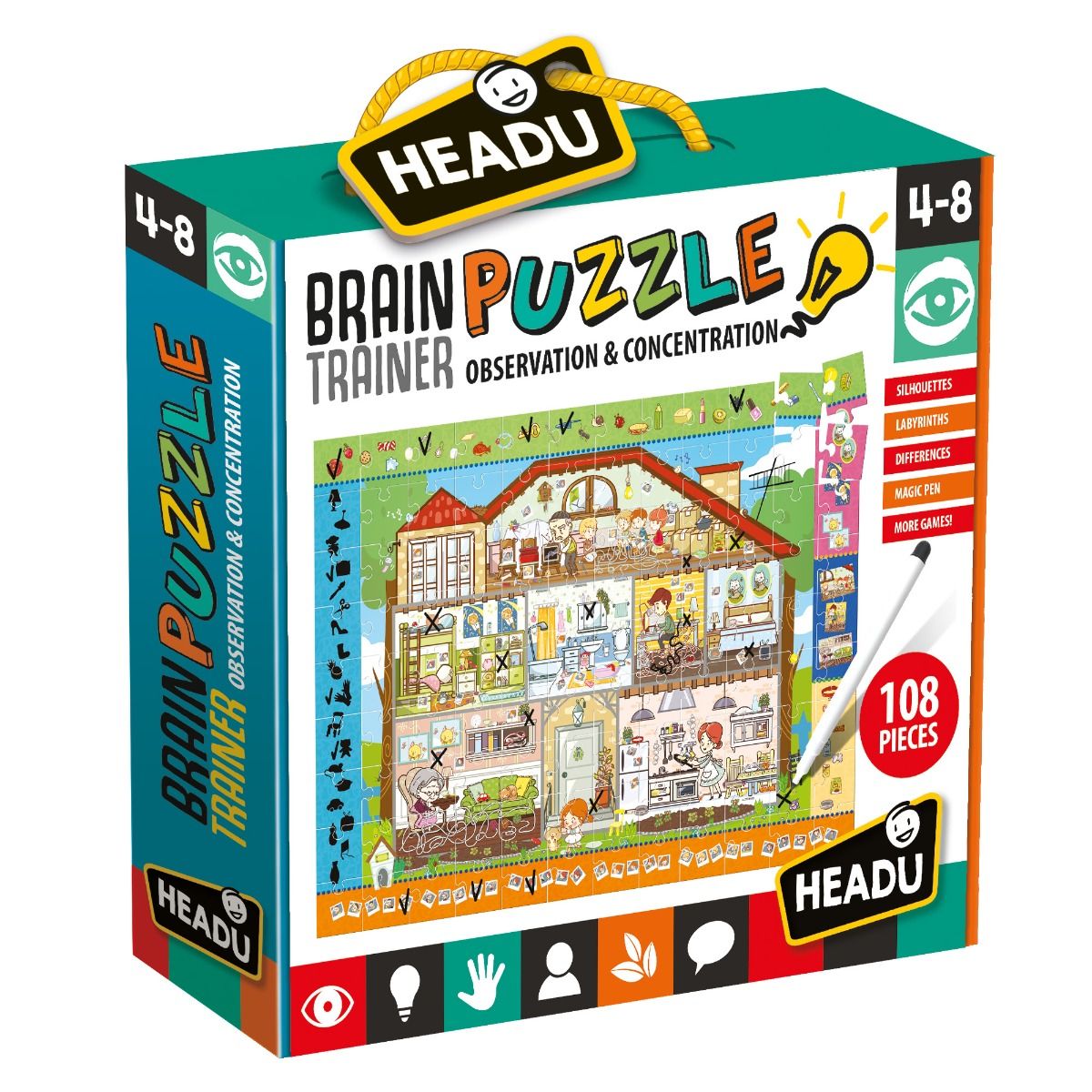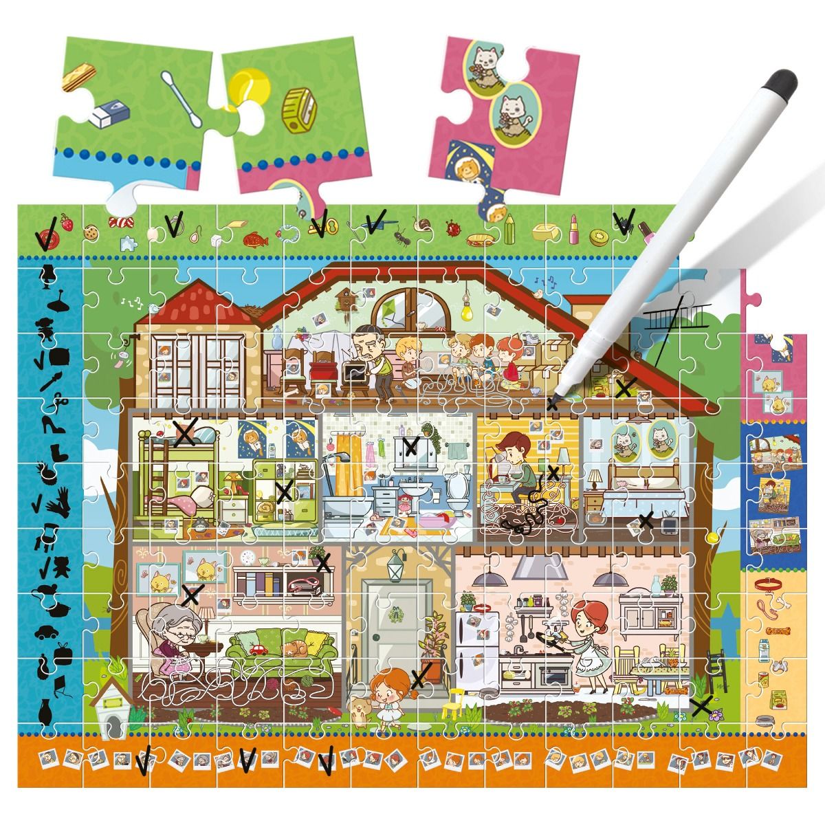 A large puzzle to be assembled and a special “draw and cancel” felt-tip pen to give children practice, by means of enjoyable exercises, in memory, observation, classification and orientation.