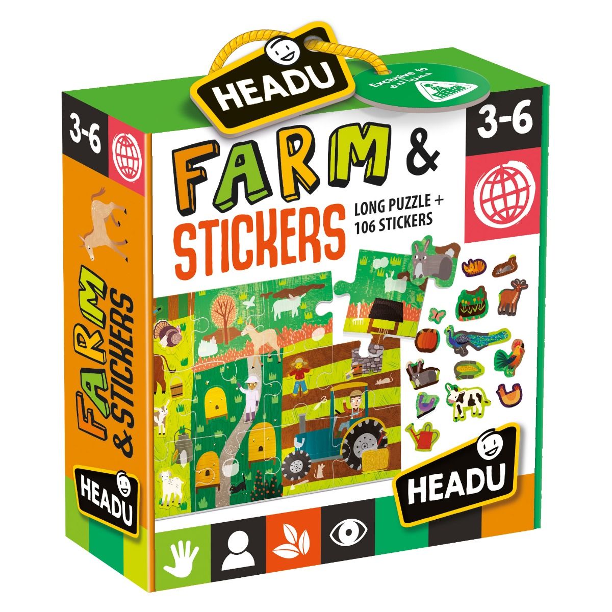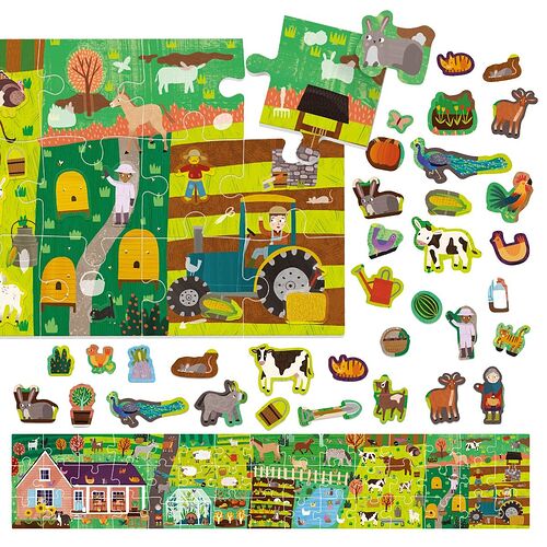 A large farm puzzle to complete with more than 100 removable stickers. Put the pieces together, study the shape of each object, find the matching sticker and stick it in the right place!
