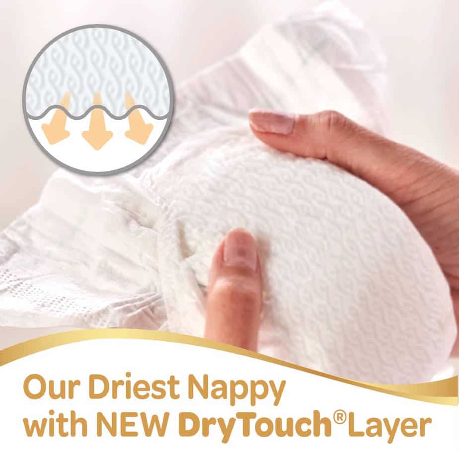 - Our Driest Nappy with a New DRYTOUCH® Layer and up to 12 hours Overnight Leakage Protection