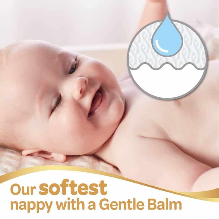 Our softest nappies featuring silk soft sides to provide protection from leaks and red marks around the legs as well as a soft and stretchy waistband for all-round comfortable and secure fit.