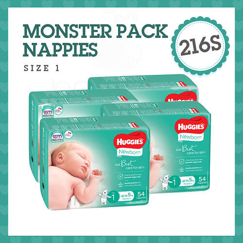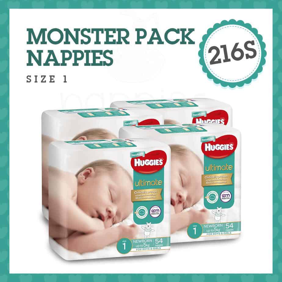 This Nappies Direct “Monster Box” ™ has four packets of Huggies Ultimate Nappies 54s.