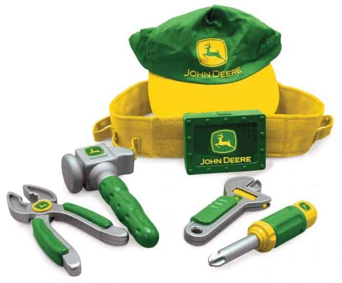 The John Deere Talking Tool Belt has stylized tools that feature “Easy Grab” grips. Toolbelt plays 5 sounds, “Nothin’ Runs Like A Deere”, “It’s time to work on our tractors”, wrench, hammer sounds “AAA” Batteres, that are included, are required for songs to play.