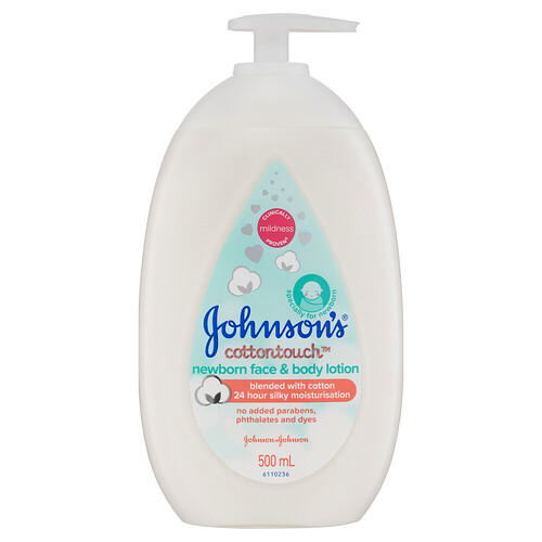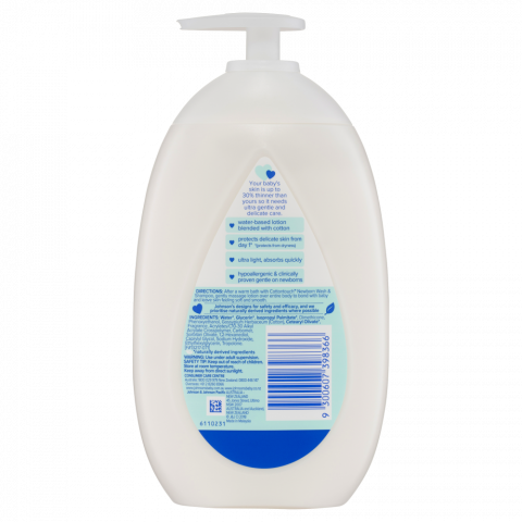 Specially for newborn. No added parabens, phthalates and dyes. Your baby's skin is up to 30percent thinner than yours so it needs ultra gentle and delicate care. - Water-based lotion blended with cotton. - Protects delicate skin form day 1 (protects from dryness). - Ultra light, absorbs quickly. - Hypoallergenic & clinically proven gentle on newborns. Johnson's designs for safety and efficacy, and we prioritise naturally derived ingredients where possible.
