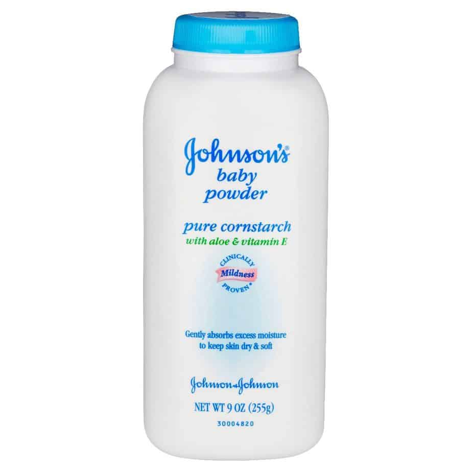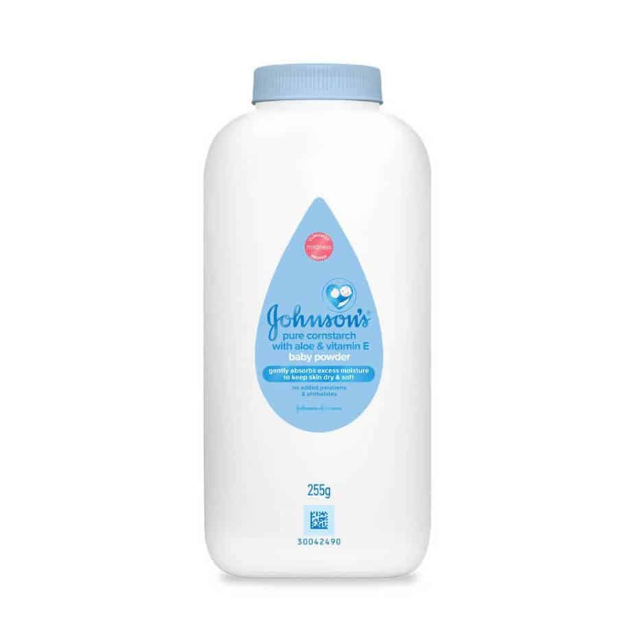 Johnson’s Baby Powder Pure Cornstarch with Aloe & Vitamin E absorbs moisture.