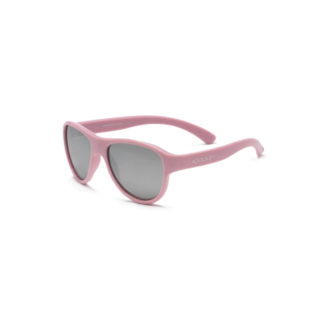 Cool flexible children’s sunglasses from the KOOLSUN brand. These KOOLSUN AIR Blush Pink children’s sunglasses have the shape of pilot’s sunglasses and come with Silver Mirror lenses. The nice thing about these sunglasses is that they are also flexible (so you can just sit on them accidentally). The sunglasses make a fashion statement and are made of highly unbreakable polycarbonate
