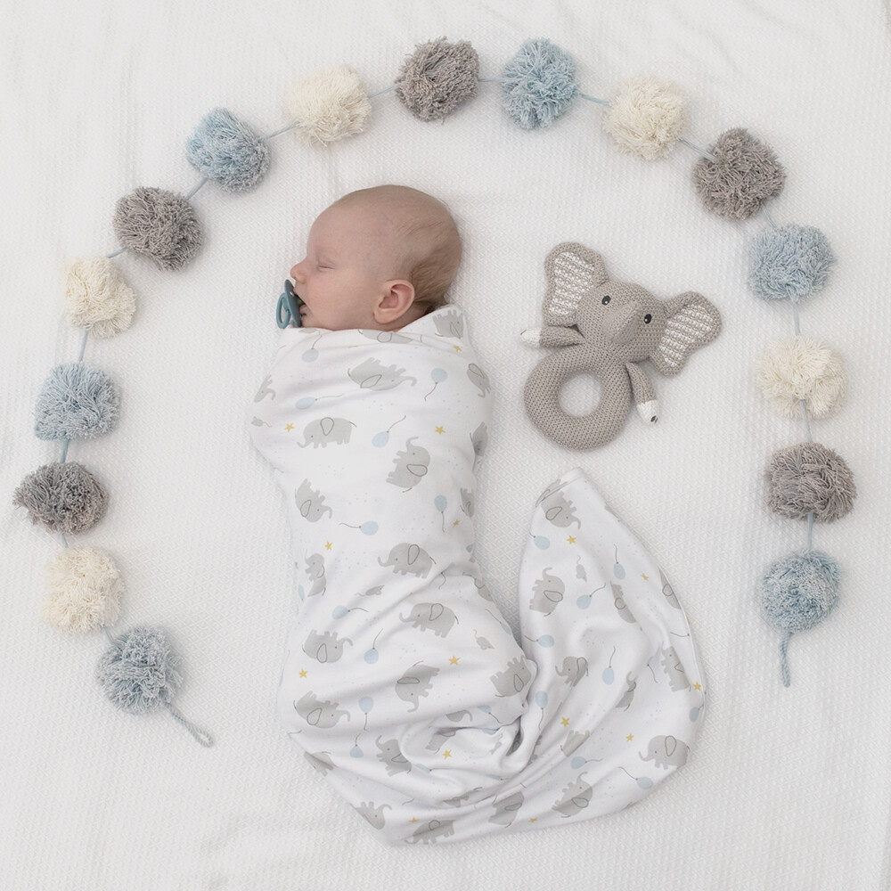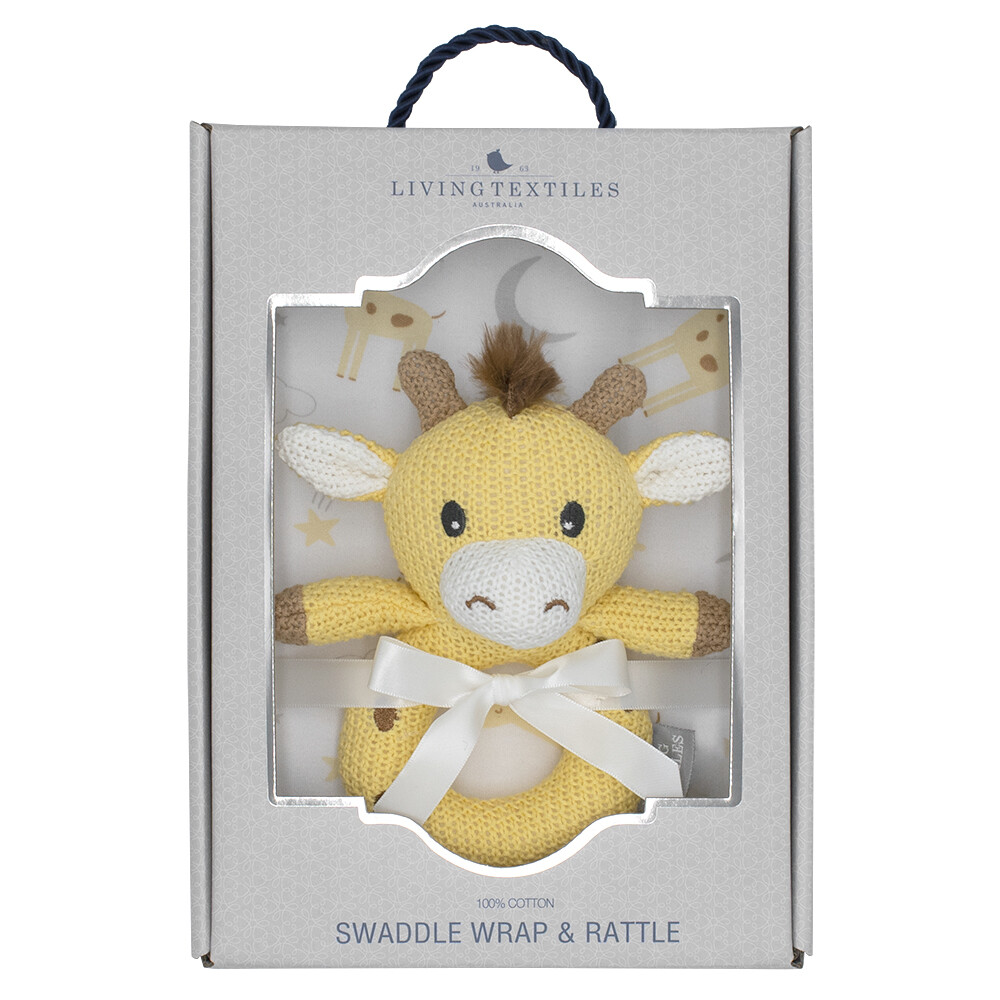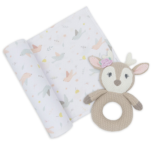 Presented in a sweet gift box, this enchanting swaddle wrap, and ring rattle gift set is the perfect ready-made gift. Made from a soft and stretchy 100% cotton jersey, the generously sized swaddle wrap is perfect for swaddling baby, as an extra layer in the pram, or even as a breastfeeding cover.