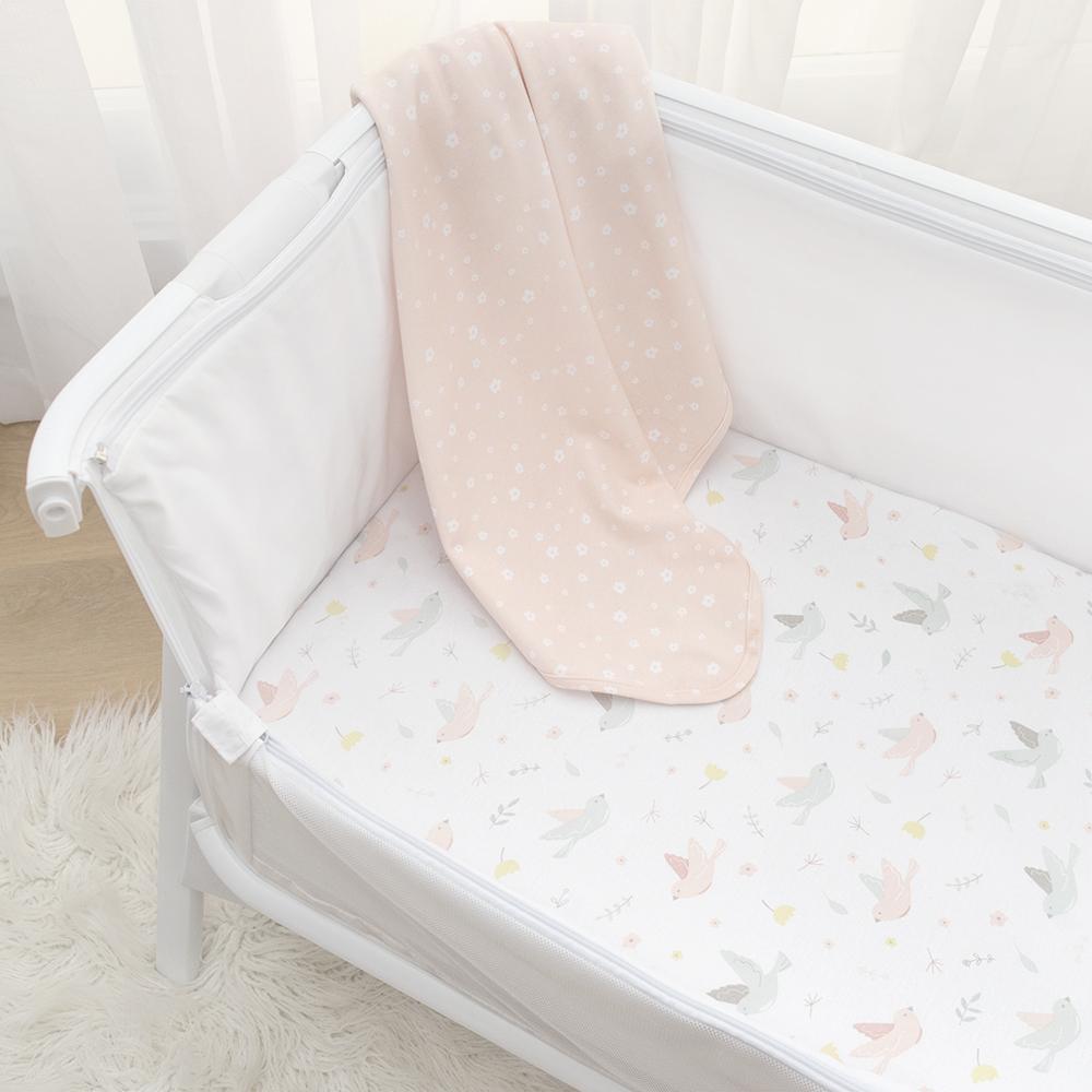 These Living Textiles fitted co-sleeper/cradle sheets will have little ones dreaming of a magical garden full or flowers and sweet singing birds. Crafted from soft and breathable premium 100% cotton jersey these sheets lay smooth beneath your little one and are perfect all year round. Featuring two complementary prints so you can mix and match, these fitted bedside bassinet sheets are fully elasticated with extra deep sides for a secure fit. Match back with our other items from the Ava collection to create the sweetest nursery for your little one.