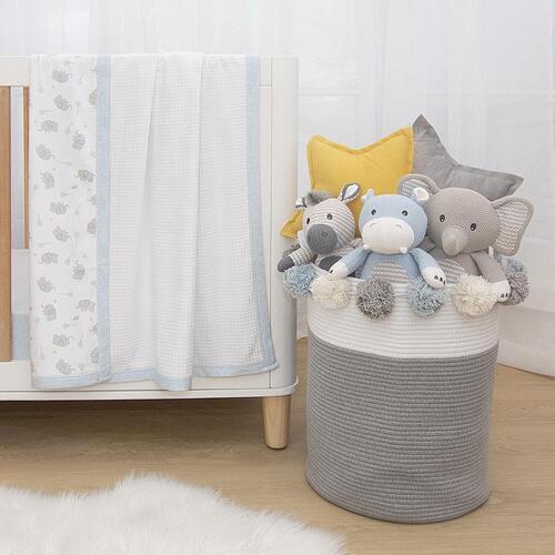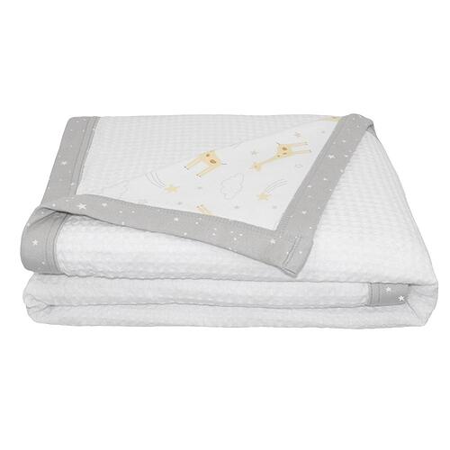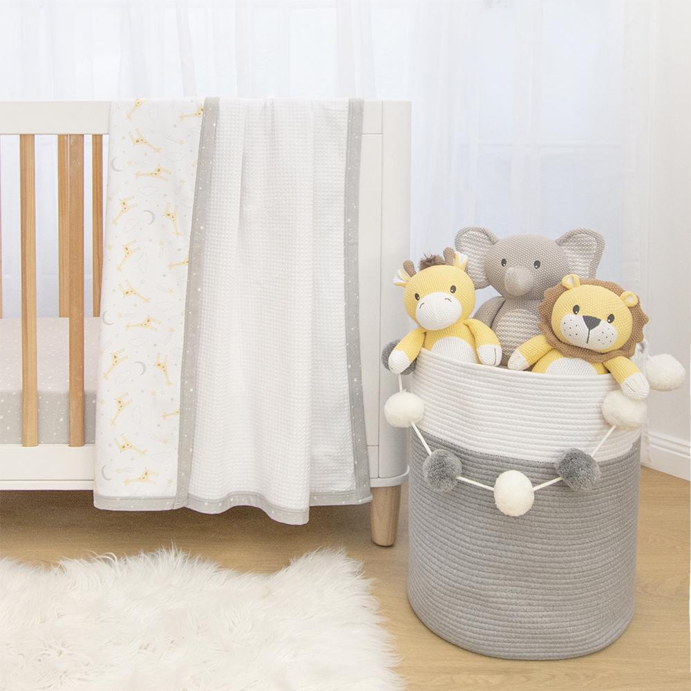 This gorgeous cot waffle blanket is backed with premium soft and breathable 100% cotton jersey, making it super snuggly and perfect all year round! Our soft and fluff waffle is specially made with a tight weave to prevent snagging and features a sweet giraffe print with a grey star trim. Match back with our other items from the Noah collection to create the sweetest nursery for your little one.