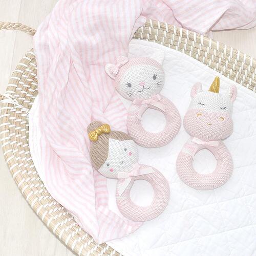 Keep baby entertained with our gorgeous Kenzie the Unicorn rattle. Made from 100% cotton knit and featuring a soft jingling rattle, Kenzie is sure to be instantly loved by baby. Match back with our Kenzie the Unicorn Knitted toy for the perfect gift
