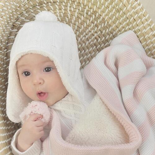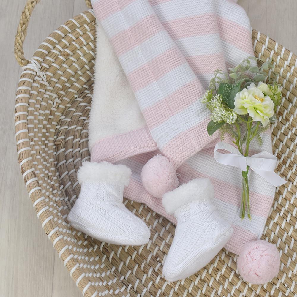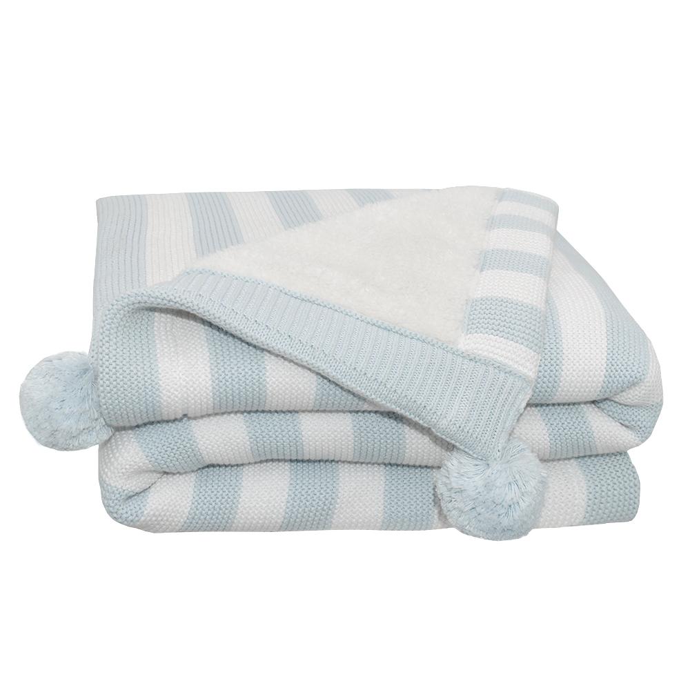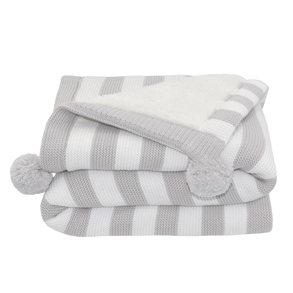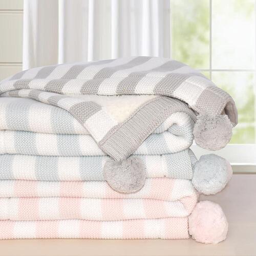 This luxurious baby blanket ensures that your little one always has the cosiest and cutest of outings. The classic 100% cotton knit stripe design, paired with adorable pom-poms, adds a dose of style to any adventure. Backed with the softest Sherpa to keep you little one toasty warm when out and about, this blanket is sure to become a favourite.