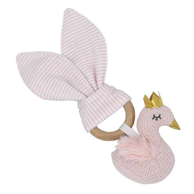 Perfect for your little one to hold, rattle and chew, this sweet teether features a natural beech wood teether ring, soft 100% cotton fabric ears backed with cotton towelling perfect for chewing on and a sweet cotton knit toy to keep baby entertained.