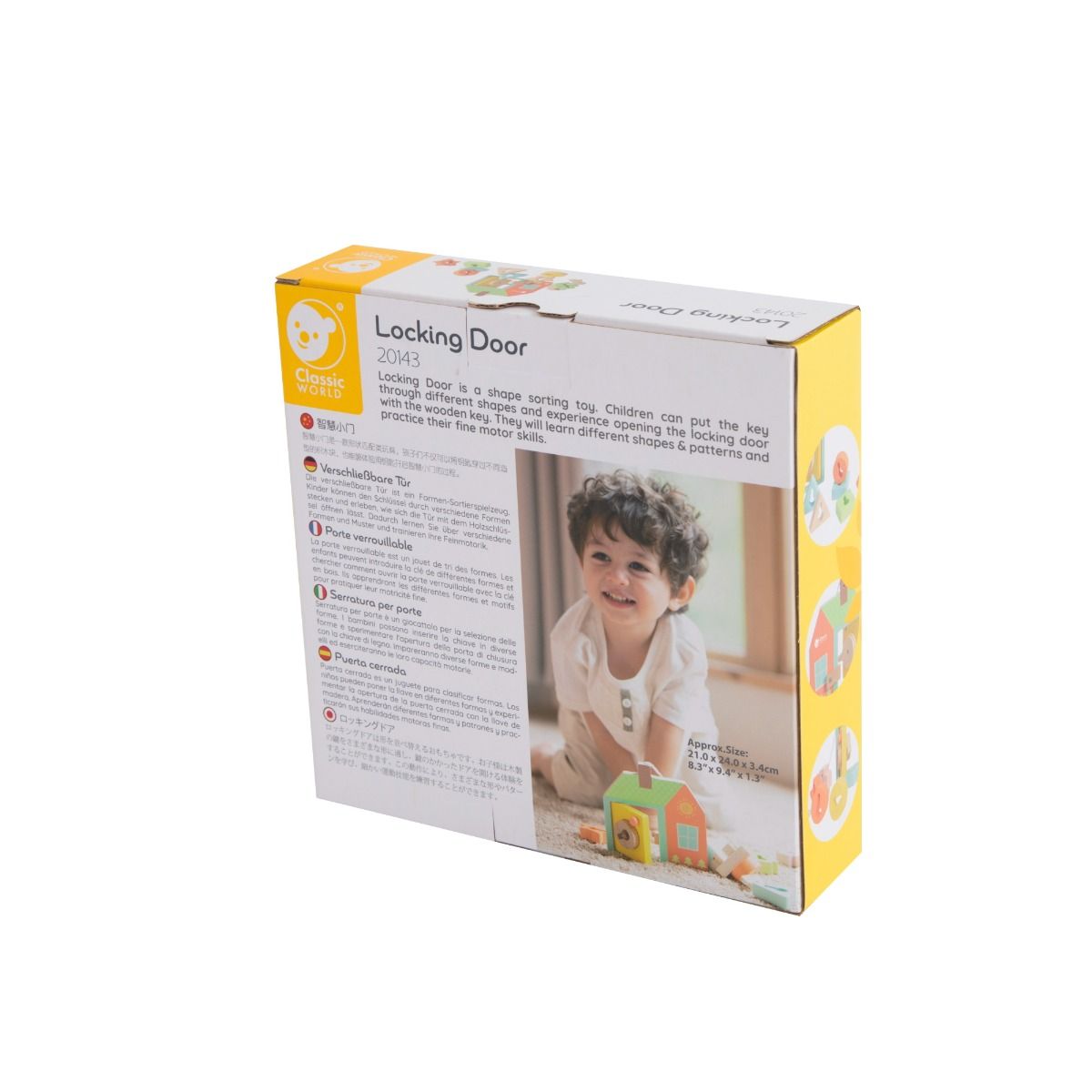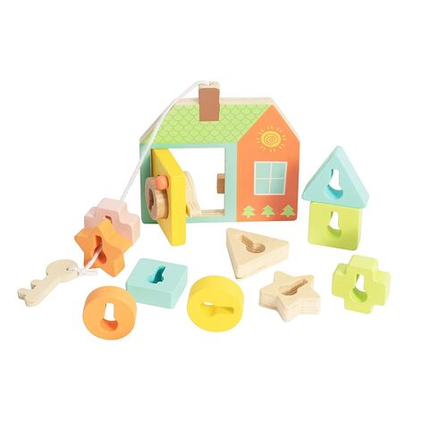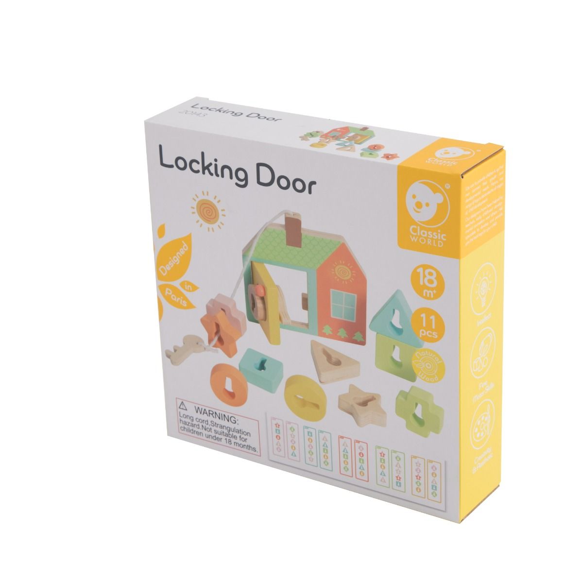 Locking Door is a shape sorting toy. Children can put the key through different shapes and experience opening the locking door with the wooden key. Helping them learn and understand different shapes and practice their fine motor skills.