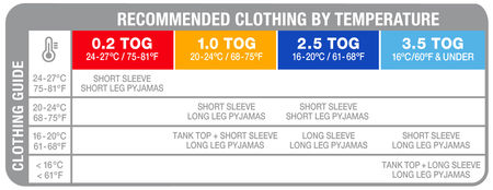 These tables are only to be used as a guide. All children are different. The number of clothing layers may vary according to a child’s health, their physiology and the temperature in the room. The care-giver must determine what is suitable.