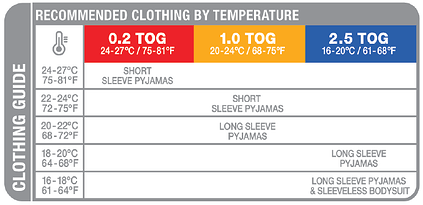These tables are only to be used as a guide. All children are different. The number of clothing layers may vary according to a child’s health, their physiology and the temperature in the room. The care-giver must determine what is suitable.