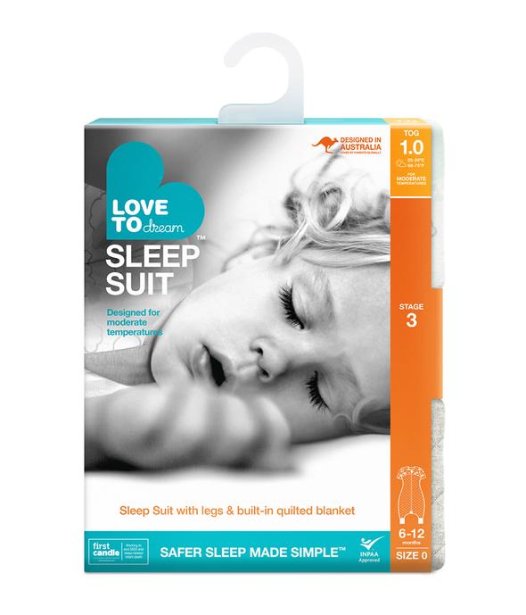 The LOVE TO DREAM SLEEP SUIT™ is an “all-in-one” style wearable blanket that completely eliminates the need for loose blankets in the cot/crib ensuring a more comfortable sleep, all night long.