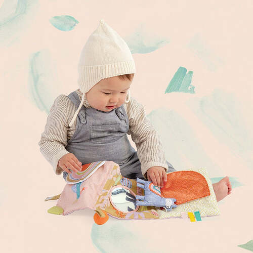 Follow the llama through different activities on each page. Folding soft book includes tethered-on squeaker llama, colorful illustrations, crinkly sounds, baby-safe mirror and engaging textures. Fabric loop allows for easy attachment to baby links. Encourages motor development, cause and effect learning. Keeps pages tidy with fabric closure.