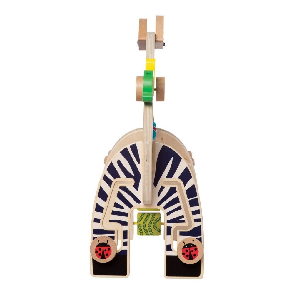 What’s black and white and fun all over? Safari Zebra wood activity toy consists 3 pieces that snugly slot together and are loaded with fun things to touch and try. There are bead runs, springy flowers, spinning gears and a green birdie resting on his tail. Adult assembly required. Zebra stands 13 inches tall from ear to foot. Teaches cause and effect learning while fostering fine motor skill development and hand-eye coordination.