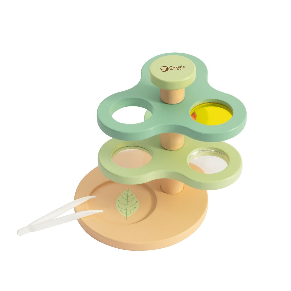 Lets explore the natural world! This microscope toy includes concave mirrors, a magnifying glass, prisms and coloured lenses. A great way to stimulate children’s interests in science and discover the magical wonders of nature.