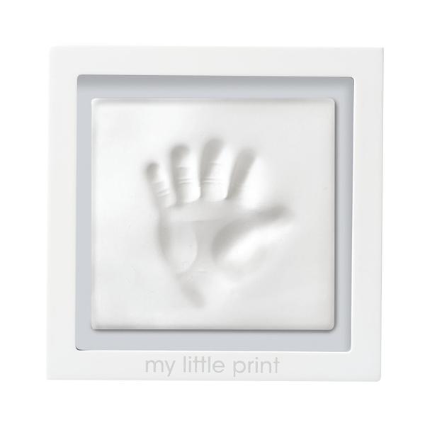 Simply knead the clay for about 2-3 minutes. Then roll the clay out with the included rolling pin onto a piece of aluminum foil (not included). Once you have the desired thickness press baby’s hand or foot into the non-toxic, soft air-drying clay. Press gently but firm enough to capture your baby’s precious imprint. Use the included ruler to cut the excess clay around the edges. Let dry for 24- 48 hours. Once dry, place the print inside the frame with the double-sided tape. This keepsake frame includes a gray background board so it’s perfect for baby boy or baby girl! The front is screen printed with the adorable saying “my little print” so your little one will always know how little their piggies were! This frame also includes a triangle hanger and an easel, so you can display it on any wall in your baby’s nursery or on any shelf. Don’t forget to include this frame in your baby registry. It makes for the perfect gift. As new parents, you will always want to remember your little baby’s prints. Cherish those memories forever with Pearhead’s babyprints keepsake frame.