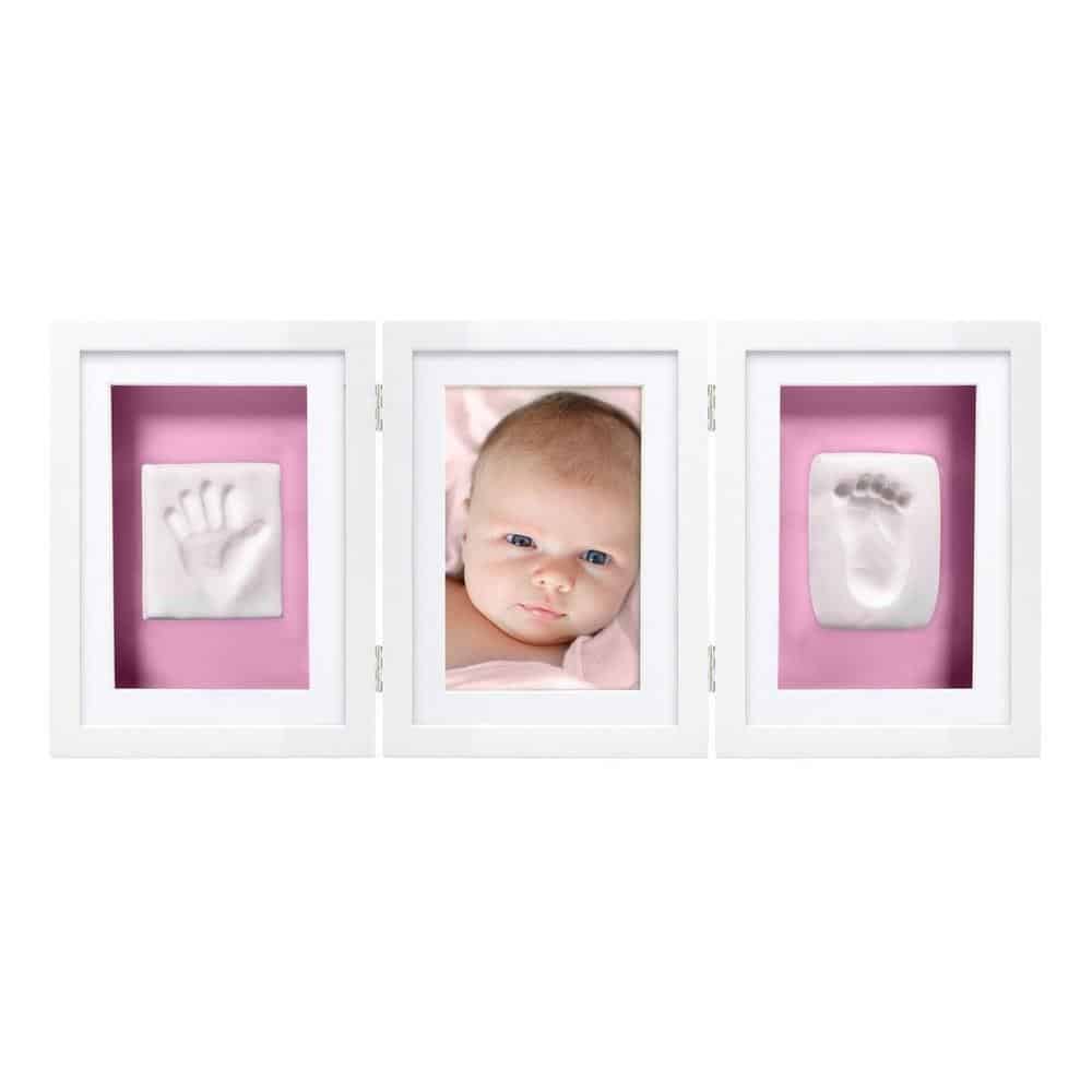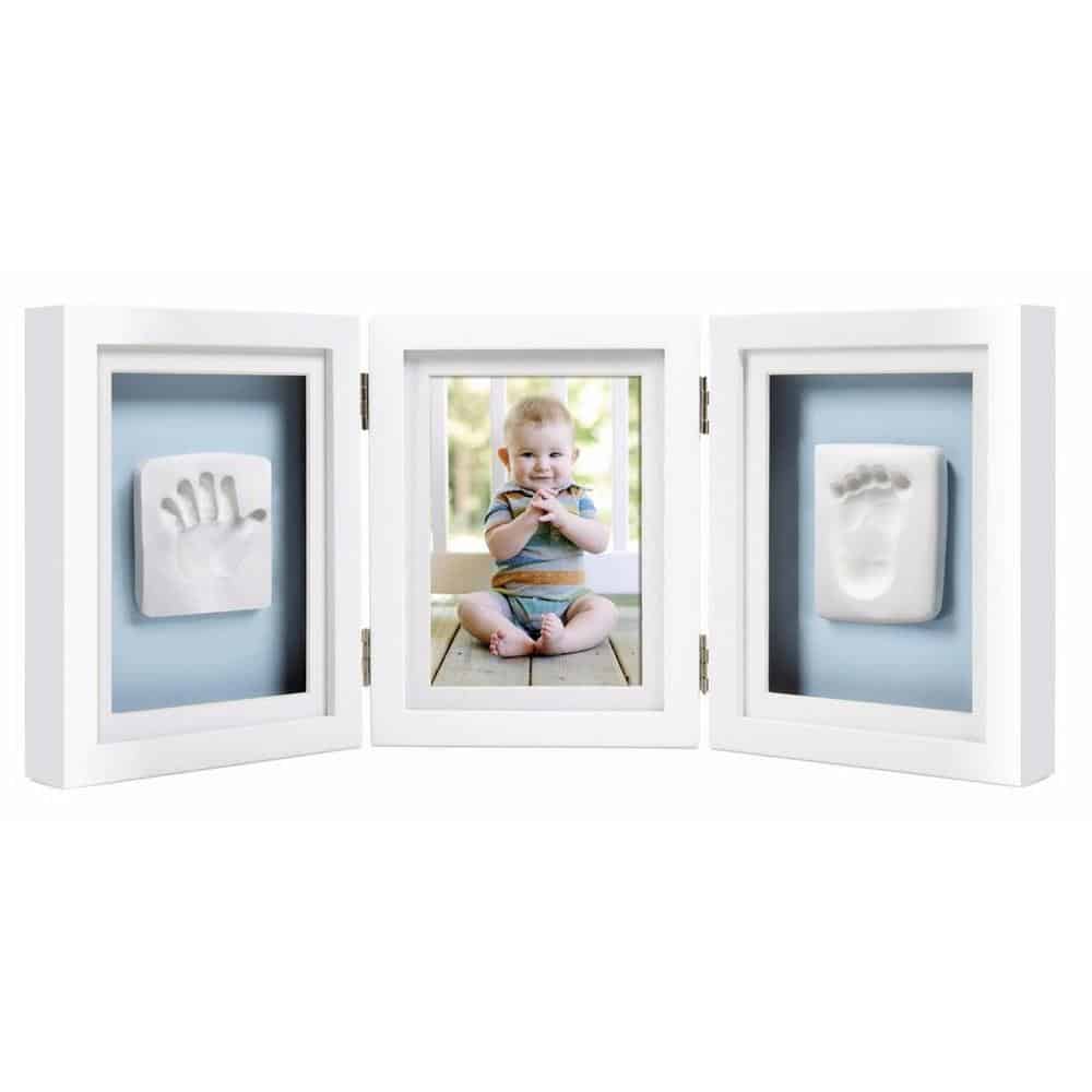 Capture and cherish your little ones prints forever with Pearhead’s babyprints deluxe desk frame. This classic frame comes in white and gray! It is a wooden shadowbox frame with three panels to display your baby’s handprint, footprint, and adorable 4" x 6" photo. Everything is included to make your little one’s prints and forever cherish them. The frame includes two packages of soft, air drying clay, a ruler, and double sided tape. Clay requires no mixing or baking! Simply knead the clay and roll it out. Press baby’s hand and foot in the clay separately, gently but hard enough to create an impression. If you make a mistake - no problem! You can redo it as many times as you need until you get the perfect impression. Once finished making the prints, use the ruler to create a square around each impression. Let dry for 1-2 days and then use the tape to stick to the reversible background board. A reversible pink and blue mat is included with the white frame and a gray mat is included with the gray frame. Now you will always be able to remember and cherish how little your baby’s piggies were with Pearhead’s babyprints deluxe desk frame. Product dimensions: 17.56” W x 7.56” H x 1.38” D; Photo insert: 4” x 6””