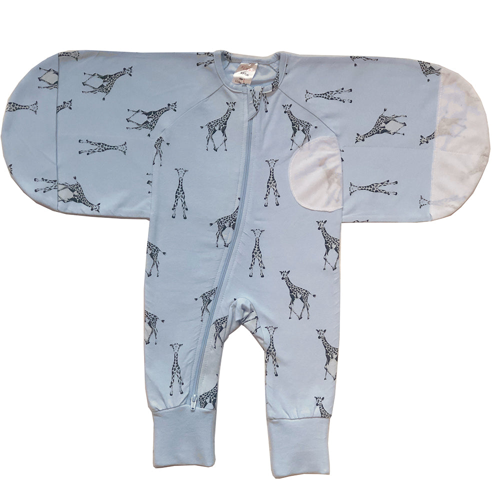 Romper design allows baby’s legs to fall out naturally and allows freedom of movement in the hips and legs for healthy hip development
