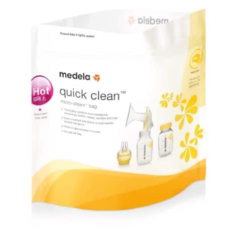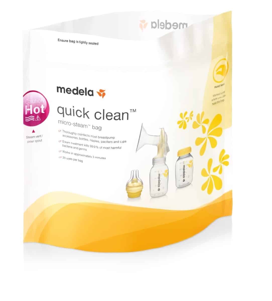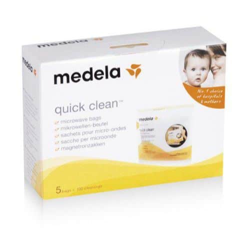 Unique and powerful, Quick Clean Micro-Steam Bags eliminate 99.9% of all harmful bacteria and germs from most breast pump parts and feeding accessories. Now you can do daily disinfecting in as fast as 3 minutes flat thanks to these easy-to-use Micro-Steam Bags. Faster than boiling and more effective than dishwashing, these bags are a real time saver for Mom. Just add water and heat in the microwave and you?re ready to go! And, these great bags are reusable too, up to 20 uses per bag. 5 reusable bags per box.